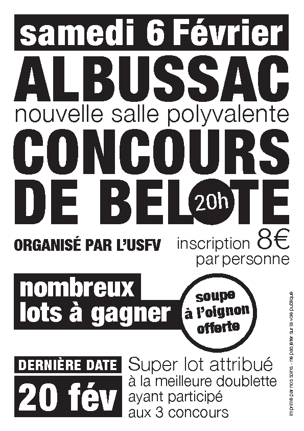 Comme à l’accoutumée, trois associations de la commune (Foot, Chasse et Dauphins) se regroupent pour proposer trois concours de belote courant janvier / février à la salle polyvalente de notre commune.