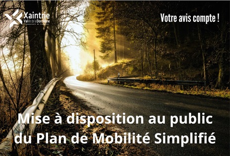 Du 17 mars au 17 avril 2026, le projet de Plan de Mobilité Simplifié est consultable en mairie et sur le site Internet de la Communauté de Communes : https://www.xaintrie-val-dordogne.fr/…/plan-de-mobilite…
