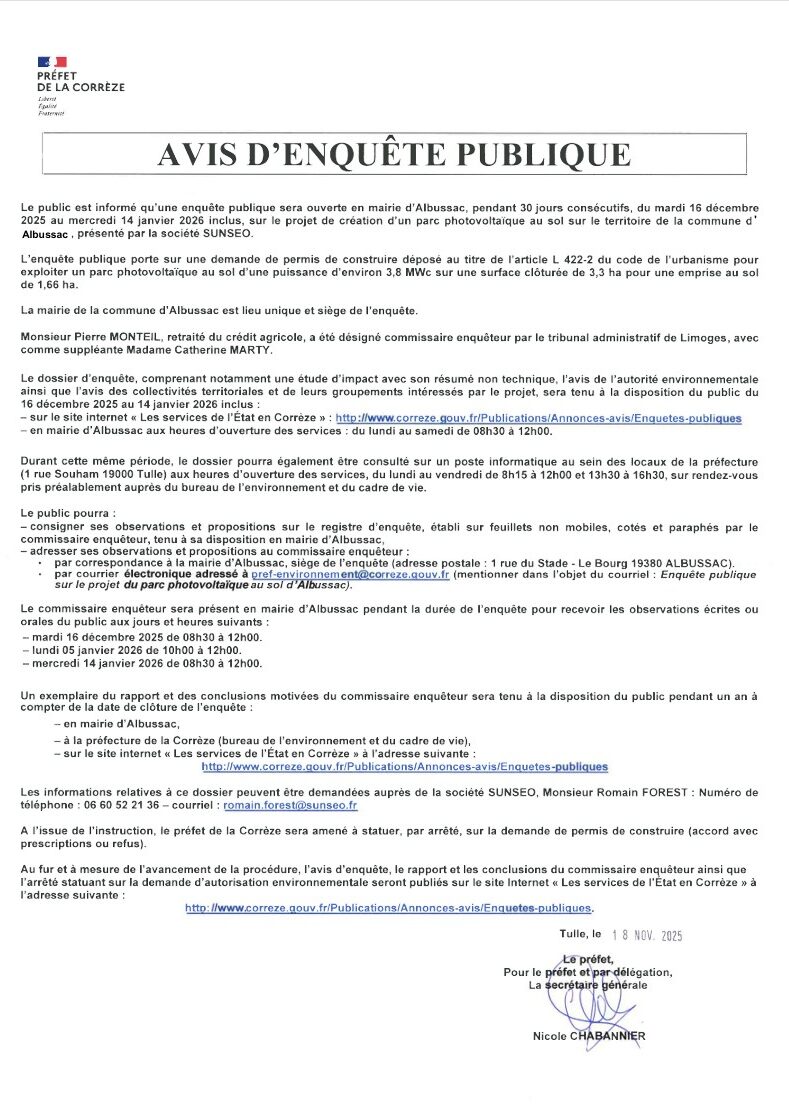 sur le projet de création d’un parc photovoltaïque au sol sur le territoire de la commune d’Albussac, présenté par la société SUNSEO.