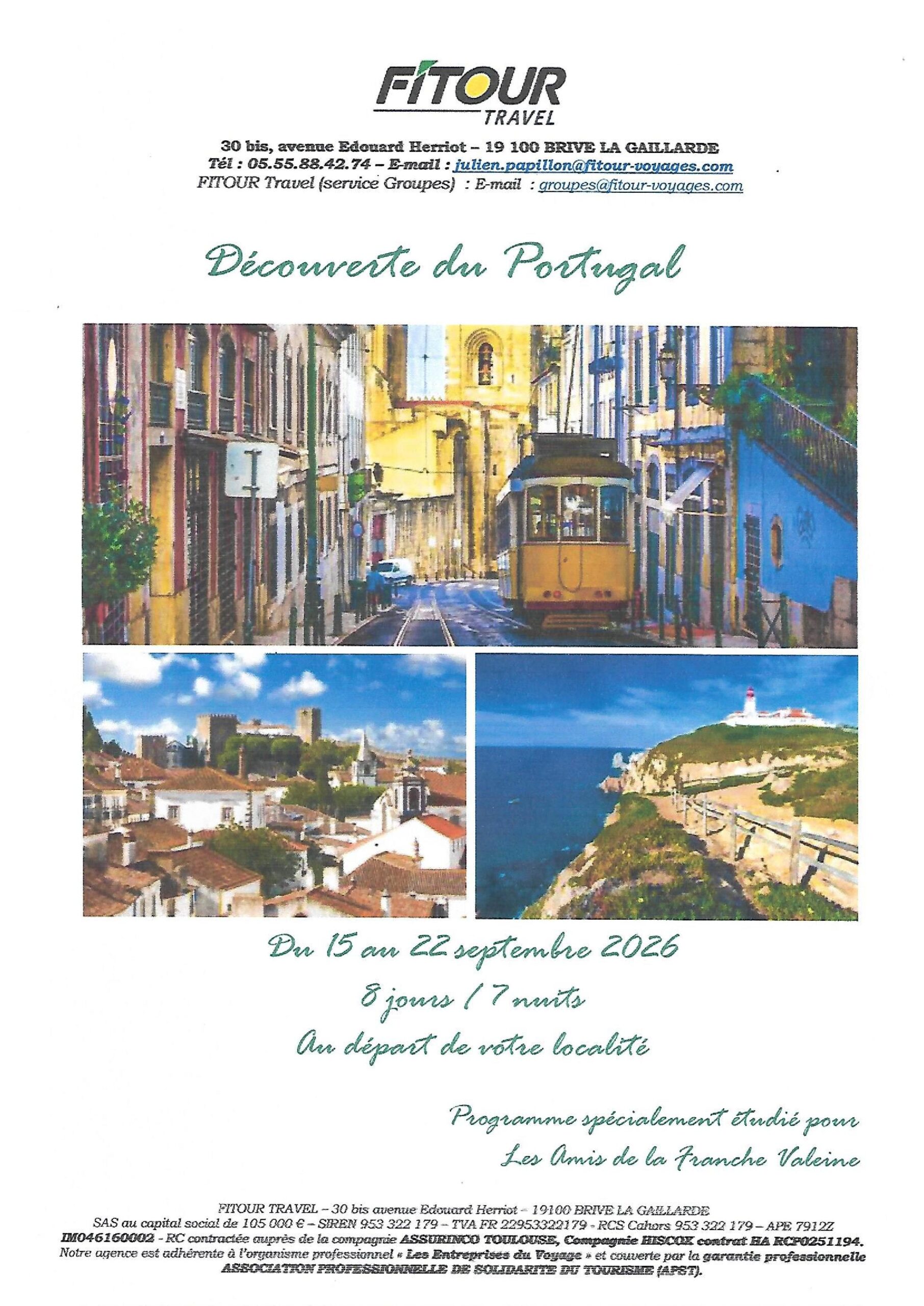 Le club des ainés Les Amis de la Franche Valeine organise un séjour au Portugal du 15 au 22 septembre 2026.