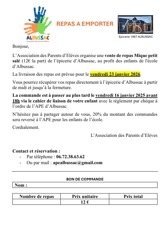 Vente de repas mique/petit salé (à emporter) au profit des enfants de l’école d’Albussac